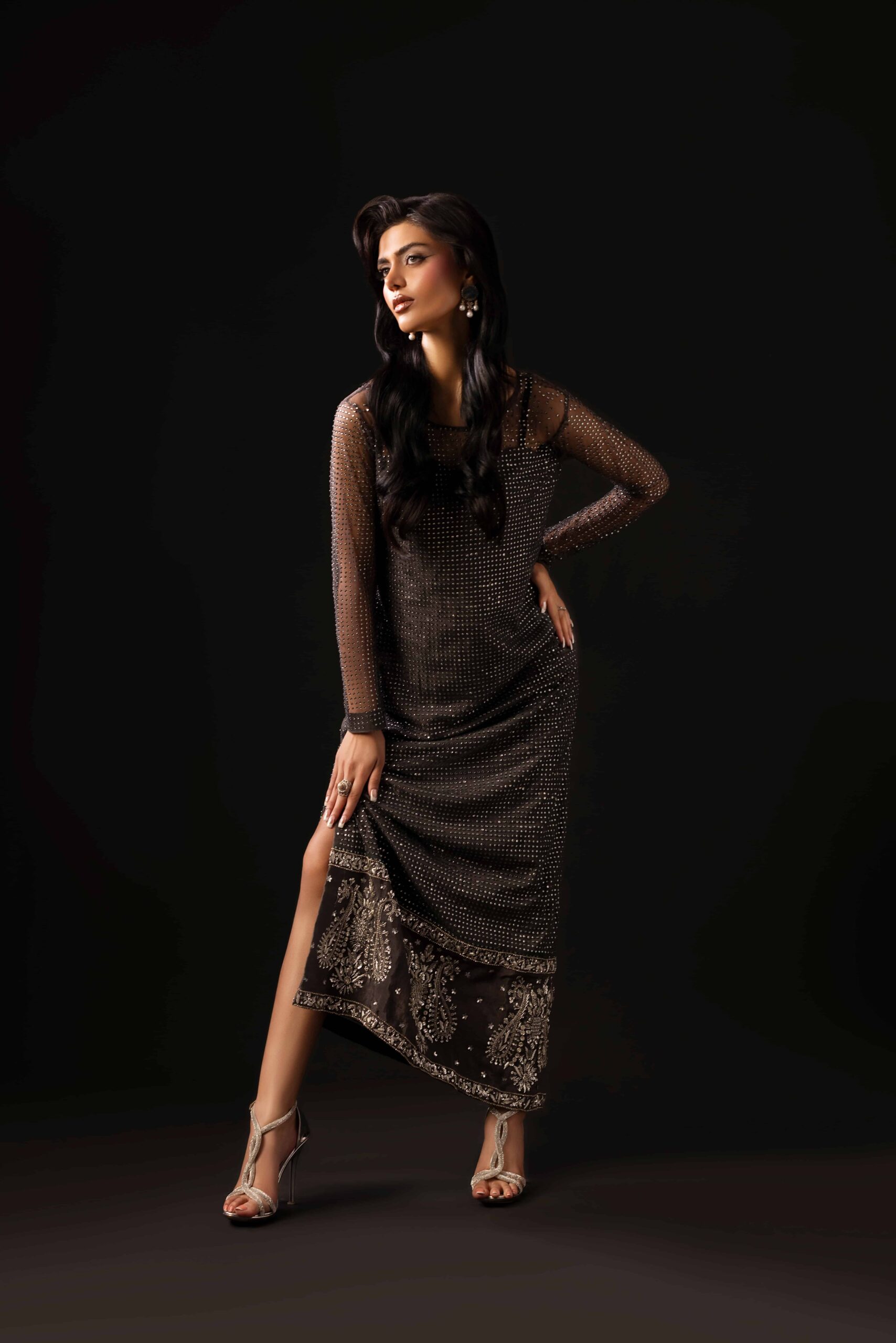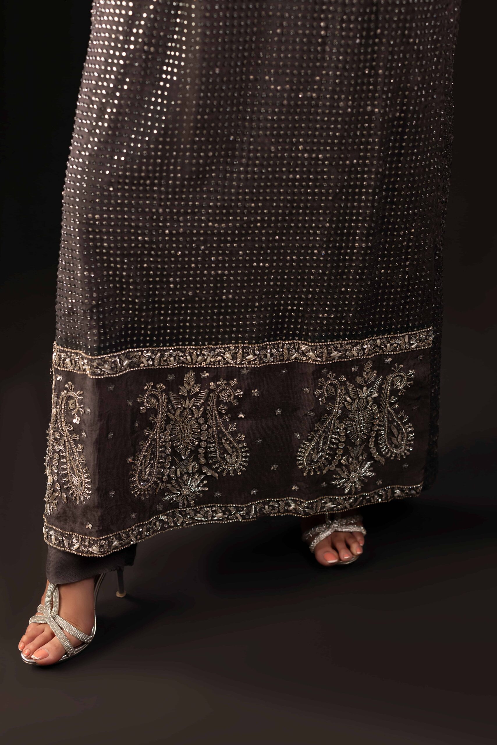 Crafted this mustured pishwas features extra flair that enhance its volume and movement, patch this Embroidey border all over the flair and waist line creating a fluid and expensive silhouette its is paired with a organza lining shawal with four sides borders and boti in all over and framed by four sides with dark Marron velvet adds the perfect finishing touch.